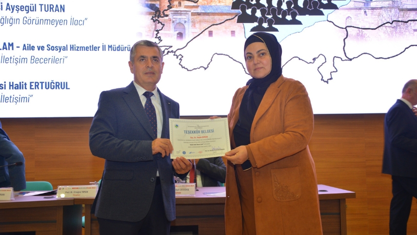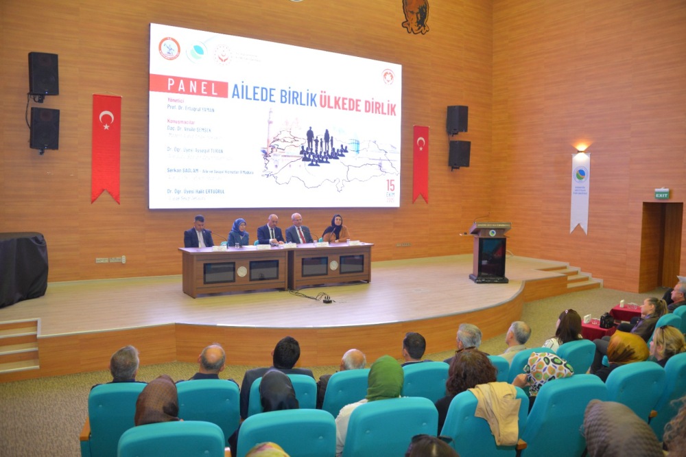 Aile ve Sosyal Hizmetler Bakanlığı Kırşehir İl Müdürlüğü ile Rektörlüğümüzün ortak düzenlediği "Ailede Birlik Ülkede Dirlik" panelinde fakültemiz öğretim üyesi Doç. Dr. Vesile Şemşek, "Modern Aileye Ahlaki Yaklaşım" konulu bir sunum yaptı. Rektör Yardımcısı Prof. Dr. Hüseyin Şimşek, hocamıza teşekkür belgesi takdim etti.